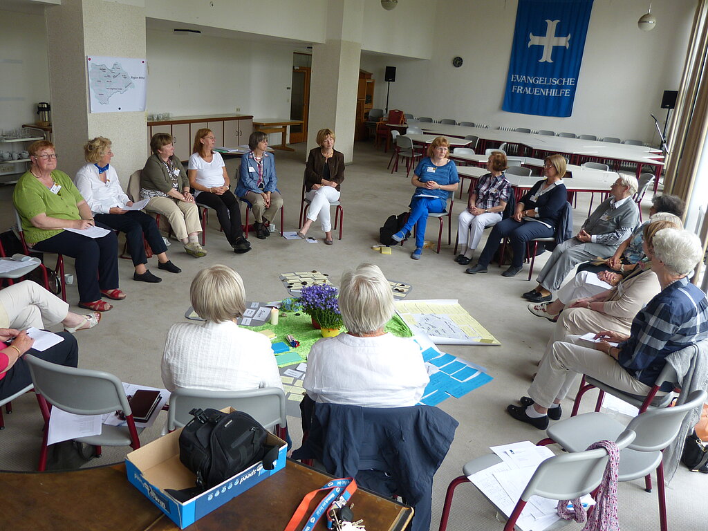 Wie kam es zur Gründung des Frauenkreises? Um ein Miteinander von evangelischen Frauen zu ermöglichen, gründete Maria Schamuhn, Gemeindesekretärin in Hangelar, am 30. September 1960 einen Frauenkreis, der sich einmal im Monat in Holzlar in der Gaststätte Heinen traf. 1961 übernahm Johanna Baumgärtel die Leitung des Kreises, der sich der Evangelischen Frauenhilfe im Rheinland anschloss. Ab 1975 verlegte der Frauenkreis seine Treffen in das neu errichtete Gemeindehaus am Heideweg. Ganz gleich, ob in der Gaststätte oder später im kirchlichen Raum getagt wurde - der christliche Glaube, die Botschaft des Evangeliums gaben und geben dem Frauenkreis Orientierung und Zusammenhalt.
