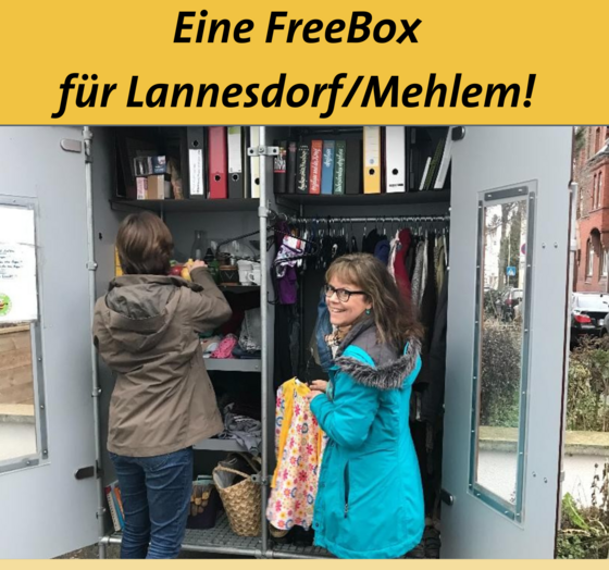 Eine Freebox ist ein öffentlicher Schrank, der nach dem Prinzip der offenen Bücherschränke funktioniert. Doch die Freebox ist für alles da – von Kleidung über Küchenutensilien und Spielzeug bis hin zum kurz geöffneten Shampoo. So kann man gebrauchte, gut erhaltene Dinge mit Leichtigkeit "loswerden" und macht anderen gleichzeitig eine Freude. Und das zu jeder Zeit, denn die Freebox hat immer geöffnet. Ein Beitrag zur Nachhaltigkeit im Stadtteil. Und nicht zuletzt ein neuer Treffpunkt für alle.