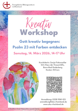 Erkunden Sie mit Farben, Pinsel und Stiften den Psalm 23 „Der Herr ist mein Hirte“. Lassen Sie sich von dem Text des Psalms 23 inspirieren und verwandeln Sie seine Worte in eigene Bilder. Malend wollen wir im Gebet zur Ruhe kommen – ganz ohne Vorkenntnisse und ohne Druck – und etwas „Schönes" schaffen.